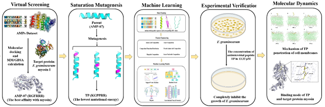 本成果通过计算机辅助药物设计和机器学习等技术筛选靶向禾谷镰刀菌的肌球蛋白的抗菌肽,并进行饱和突变获得显著提高亲和力和稳定性的最优三重突变体,将其应用于禾谷镰刀菌引发的小麦赤霉病的防治,效果优于小分子氰基丙烯酸酯类杀菌剂——苯噻菌酯。