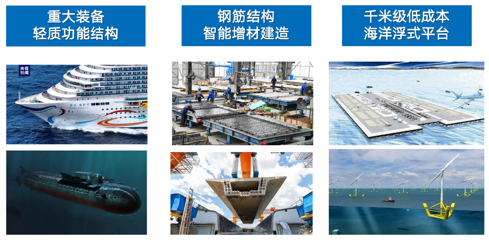 低成本型材,暨钢板点阵混凝土结构,是一种新型海洋基建材料,相对全钢结构海洋平台,可显著降低用钢量,综合建造成本降低70%以上,兼具经济性、密封性、稳定性和安全性等,适用于海洋浮式风电、岛礁建设等领域。